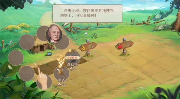 通过一段对话了解基本剧情,接着点击土地,开启种植作物的操作。