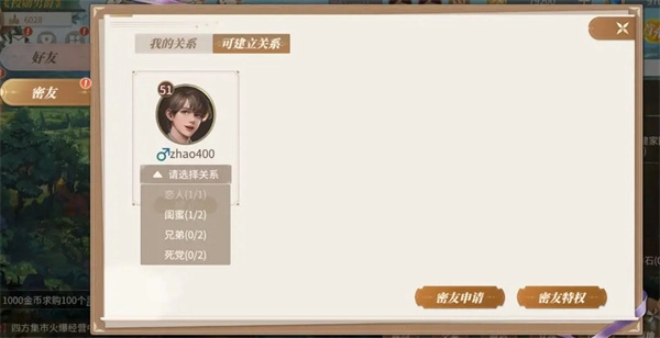 密友包含恋人、闺蜜、兄弟、死党这四种身份关系,其中恋人仅有1个名额,其他几种关系各有2个名额。