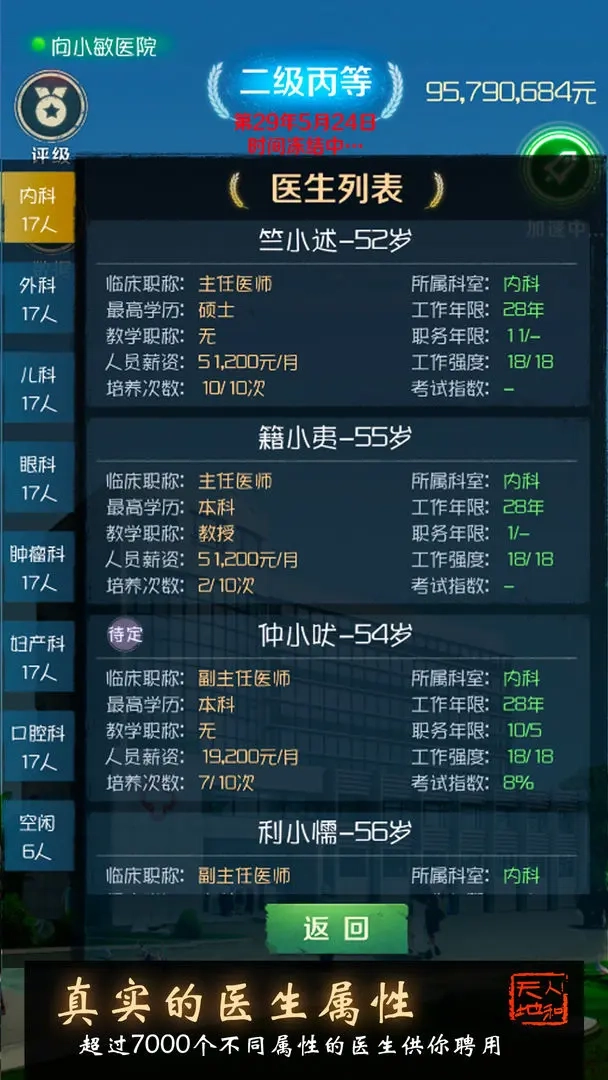 《我是院长》是一款文字模拟经营游戏,玩家将在游戏中拥有一家专属医院,医院的发展轨迹完全由玩家的决策所主导。游戏里,所有医生都需通过招聘获取,每位医生都具备不同的学历背景,学历越高的医生,通过职称考试的几率就越大,而这一结果将直接影响医生对各类疾病的治愈概率。