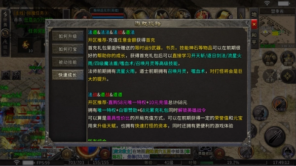 获得首充礼包后,就能直接解锁开天斩、逐日剑法、流星火雨、四级魔法盾、嗜血术、召唤月灵等高级技能。其中法师前期可掌握流星火雨,道士前期能习得召唤月灵与嗜血术,这些技能对打怪效率将有显著提升。