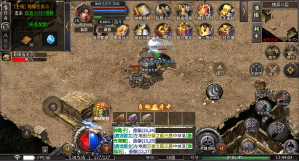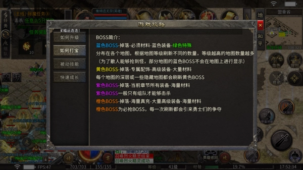 橙色BOSS:会掉落海量真充、大量高级装备和海量材料,是必抢BOSS,每次刷新都会引发勇士们的激烈争夺。