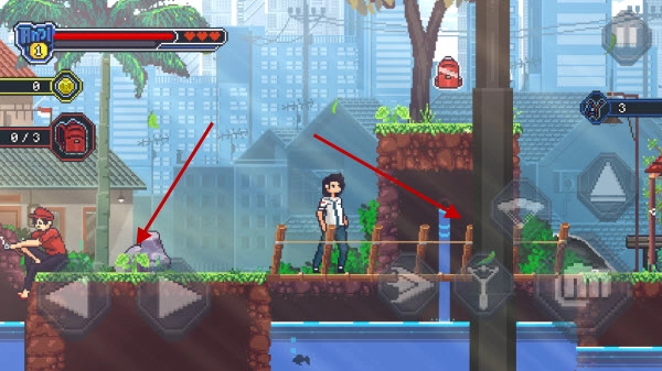 通过屏幕下方的按钮操控角色移动、攻击、跳跃。