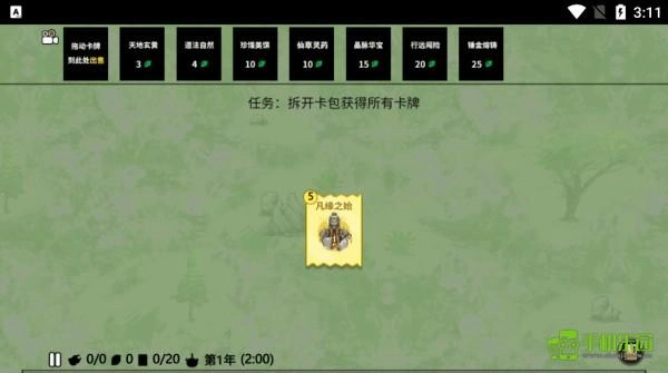 点击卡包会生成5张各不相同的卡牌,每张卡牌的内容都是随机分配的,但初始开出的卡牌中必定包含一张凡人卡牌。
