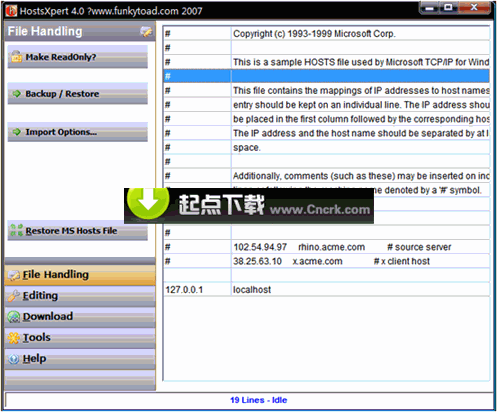 HostsXpert V4.4 英文绿色免费版 HostsXpert Hoster 是一款适用于你的 HOSTS 文件让你可以替换记录,合并 HOSTS 文件,切换 127.0.0.1 记录为 0.0.0.0 等的编辑器软件。该软件主要用于提交间谍软件,广告软件和广告拦截。该软件包括一个用于编辑文件内容的内置的文本编辑器,一个下载和合并拦截文件(MVPshosts,hpHosts)的选项以及一个用于备份和恢复原始 HOSTS 文件的功能。这是一个独立的软件,不需要安装