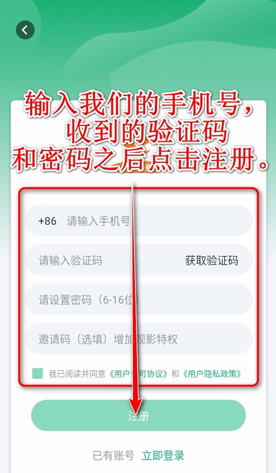 6. 输入手机号,在收到验证码与密码后,点击“注册”。
