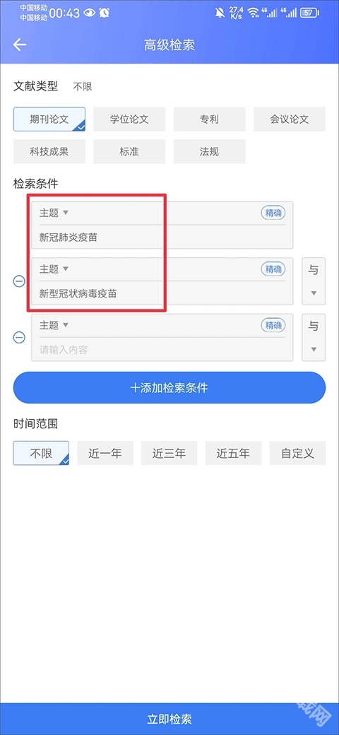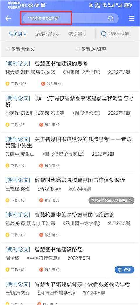 直接输入检索词进行检索属于模糊检索,这种检索方式会对输入的内容进行拆分,若需查找更全面的信息,可采用该方式。若要查找更精确的信息,则可使用精确检索。精确检索不会对输入的内容进行拆分,而是将检索词作为一个整体进行检索,其实现方式是对检索词添加双引号“”加以限定。例如,若想查找与“智慧图书馆建设”相关的文献,检索式为(智慧图书馆建设)时属于模糊检索,而加上双引号变为(“智慧图书馆建设”)时则为精确检索。