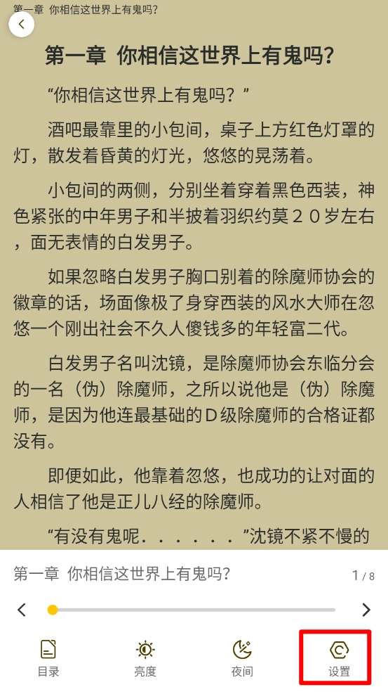 在阅读界面点击中间区域呼出菜单,再点击右下角的“设置”选项。