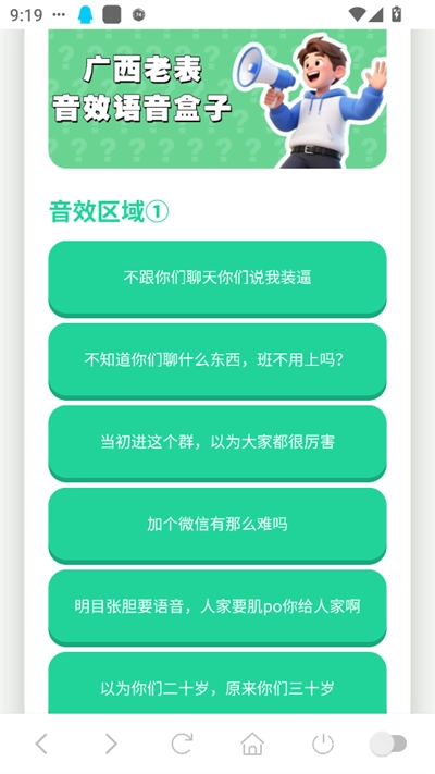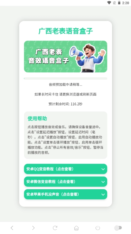 广西老表语音盒是一款完全免费的趣味语音软件,里面专门收录了超多魔性又接地气的广西风味语音片段。不管是搞怪的问候语、方言搞笑内容,还是经典的梗段子,这里全都有。只需一键就能播放,还能轻松调节模式,让你畅听原汁原味的广西口音语音包。