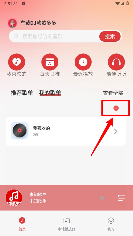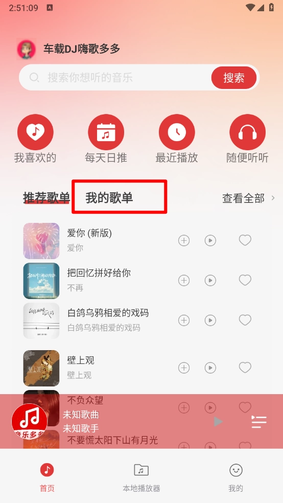打开车载DJ嗨歌多多,在主页点击"本地播放器"。