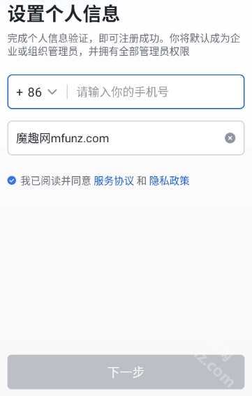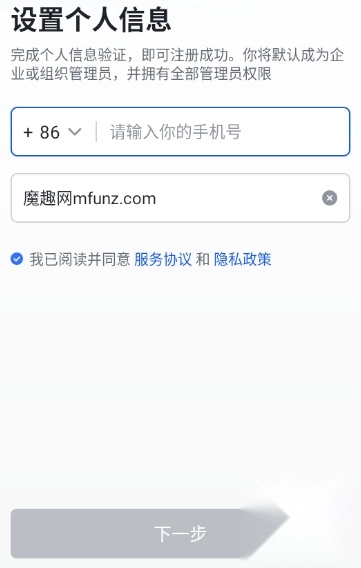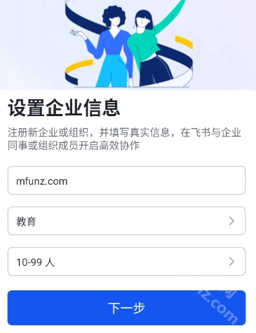 最后把企业或组织名称、行业类型、人员规模等信息填写完毕后,点击下一步按钮。