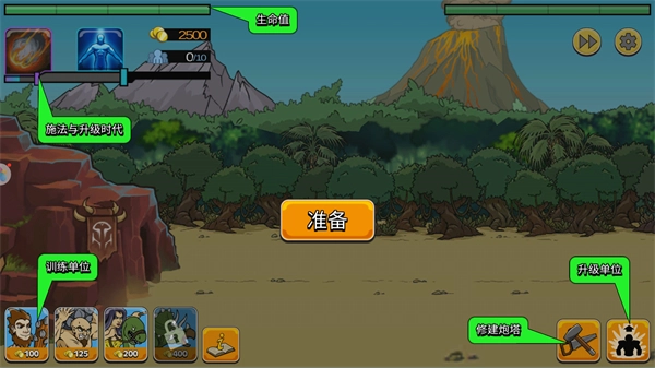 这是《战争进化史2》的初始界面,找到并点击界面中的开始按钮,就能启动游戏进入关卡,这是开启该游戏的核心初始操作步骤。