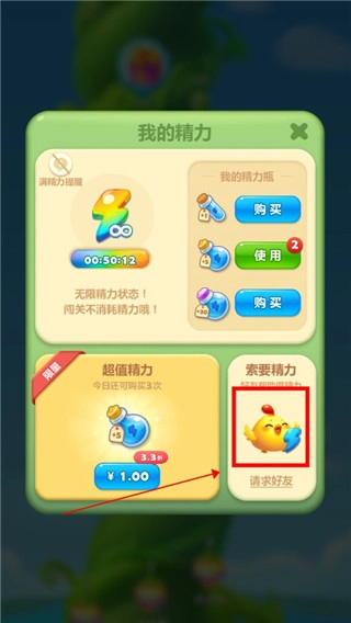 进入后就能看到精力会随时间自动恢复,要是觉得恢复速度太慢,还可以用精力瓶直接补充。要是道具用完了,点击右下角的“分享好友”按钮,好友还能给你分享一些精力。