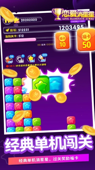 经典单机闯关:经典单机消星星,过关奖励福卡。