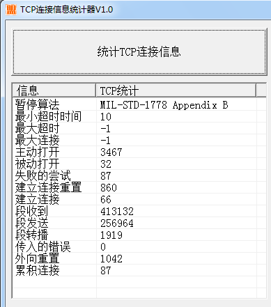 TCP连接信息统计软件 1.0 绿色版 TCP连接信息统计器是一款操作简单且可以迅速统计出TCP链接信息的软件。点击软件上方的统计TCP连接信息按钮即可立即显示,段转播,传入的错误,最大超时,最大连接等统计值。欢迎下载使用。