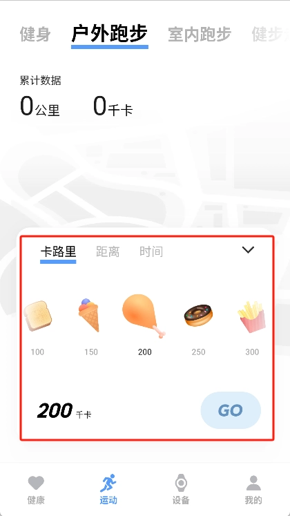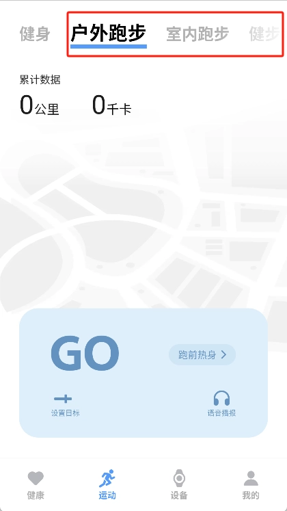 运动记录:用户可以选择不同的运动类型,如户外跑步、室内跑步等;