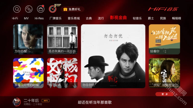 HiFi音乐采用暗红色交替色作为底色,选择框以白色突出显示所选位置,整体视觉效果十分醒目。