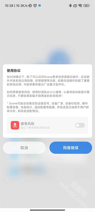 在魔趣网下载并安装Scene工具箱后打开它,找到界面上的“ADB模式”按钮并点击,弹出风险提示弹窗时选择同意,之后即可进入Scene的主页面,查看各类软硬件相关信息。