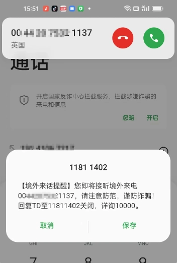 手机可能会接到境外打来的电话,一旦接听,对方就会以短信形式发送一条注册验证码过来。