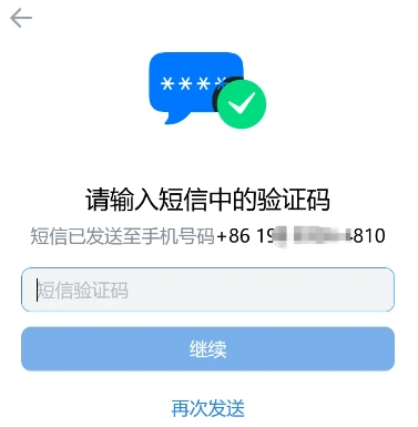 点击“继续”按钮后,页面会跳转到输入验证码的环节,此时需要填写收到的短信验证码内容。