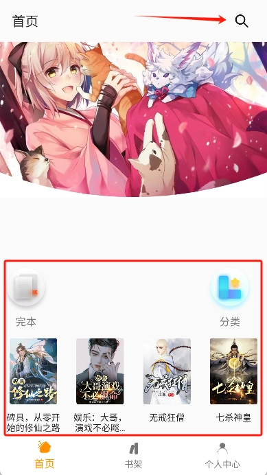 你可以在首页、完本或者分类板块里浏览推荐的书籍,也能直接在搜索框输入书籍名称来查找。