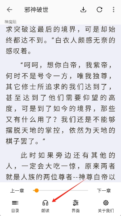在阅读页面,用户点击屏幕中央后,选择“朗读”按钮,系统便会自动播放书籍内容。