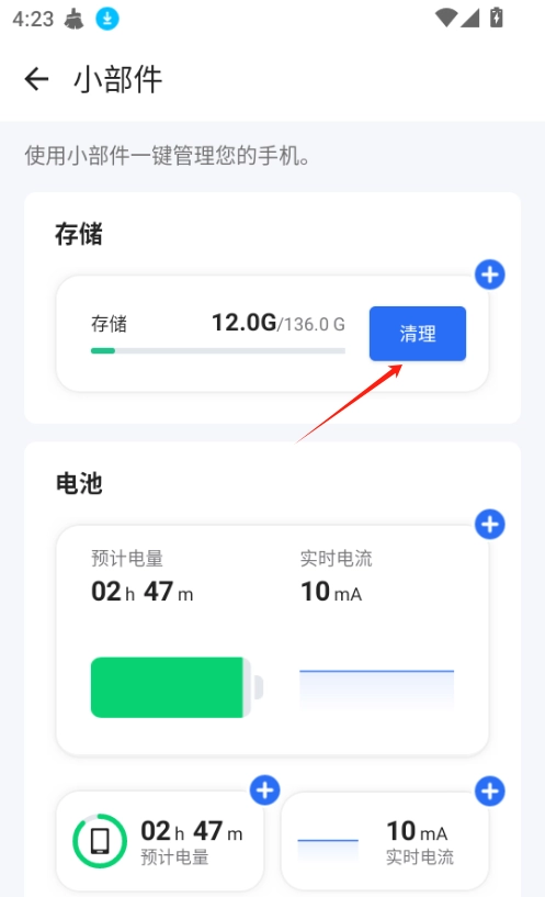 主页点击右上角图标,可以查看小部件以及清理存储。