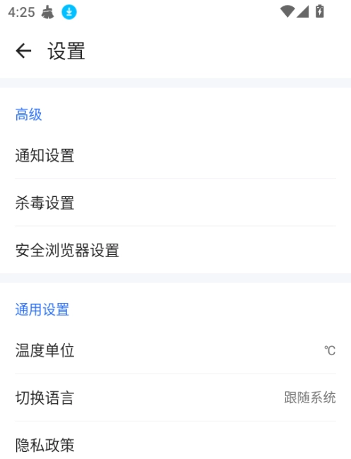 点击【我的】进入设置页面,在那里可以进行通知设置、杀毒设置、安全浏览器设置以及部分通用设置。