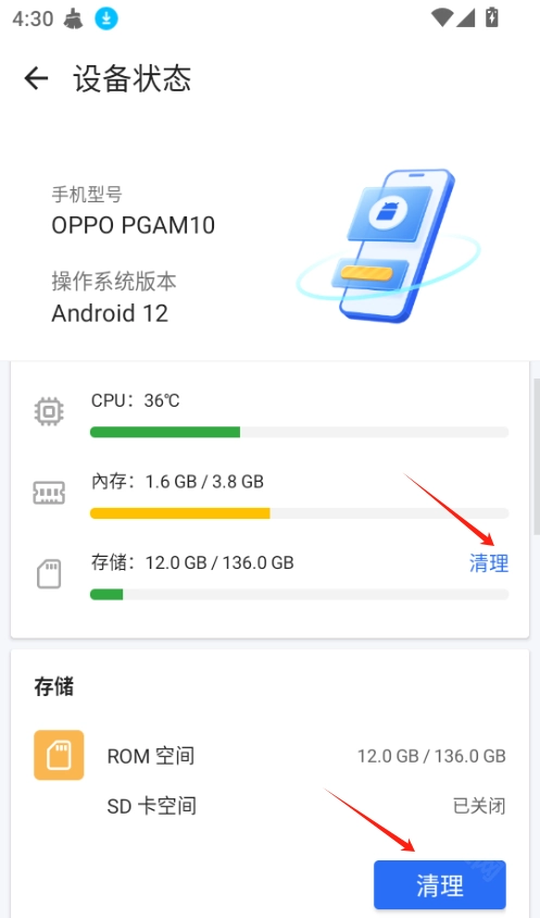或者直接进入设备状态界面,在该界面中,能够对状态信息、存储数据以及屏幕进行清理操作。