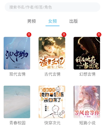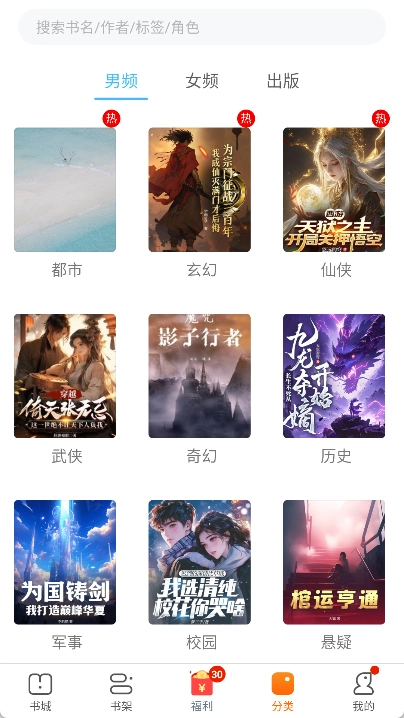 还设有详细的分类页面,用户能够选择男频或女频小说,查看不同类别的小说内容。