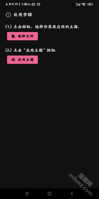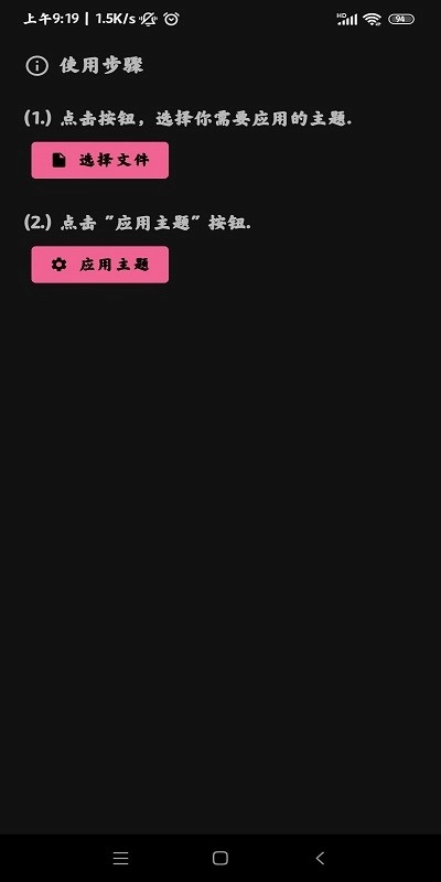 用户可以点击首页的“应用主题”进入对应页面,之后点击“选择文件”,从手机里导入主题文件。