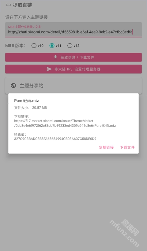 同样在首页点击“提取直链”进入页面后,输入主题链接并点击下方的“获取信息/文件”,之后就可以通过上方提到的方法进行主题设置。