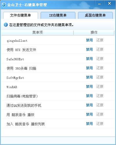 金山右键菜单管理是从金山卫士中提取出来的一款右键菜单管理工具.软件轻巧,使用方便.只需打开软件,一键清理就可以扫除所有垃圾菜单,还您一个健康快速的电脑。