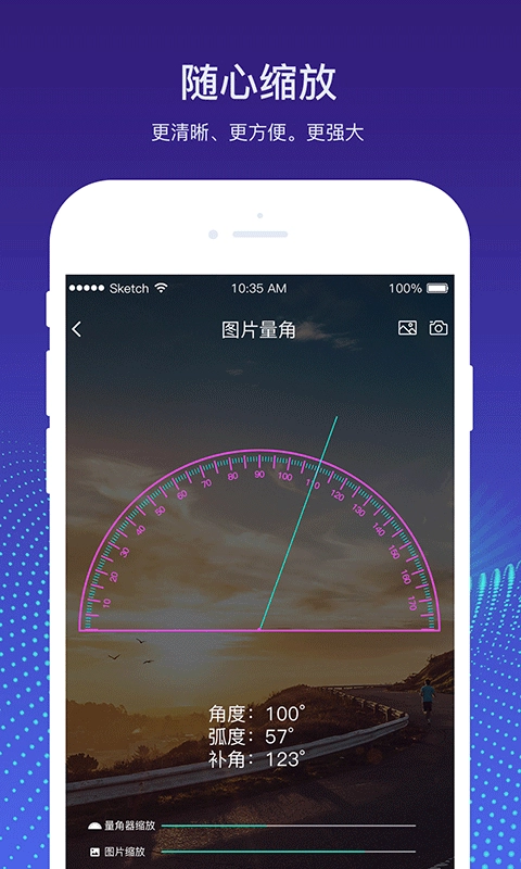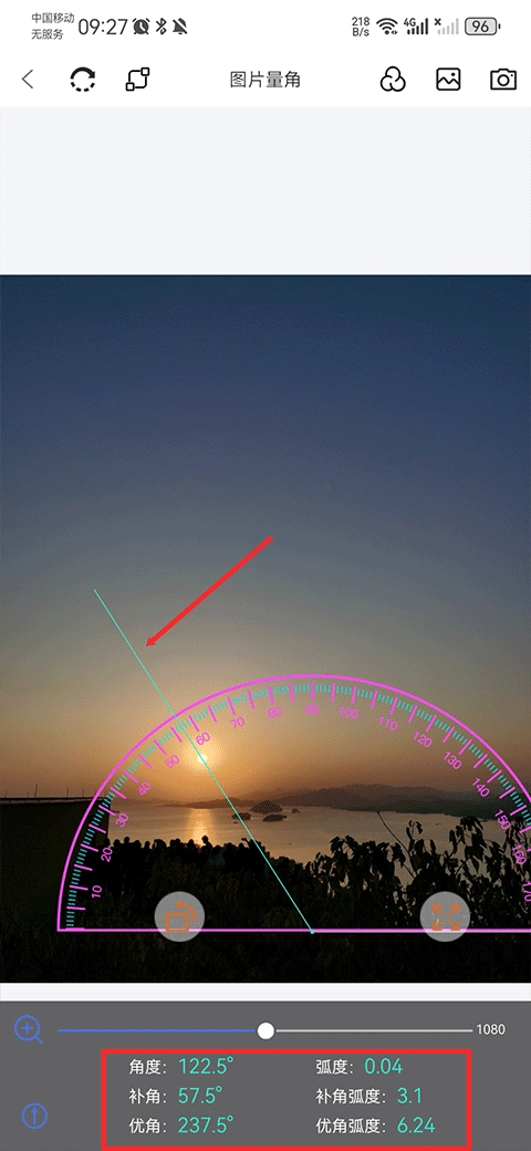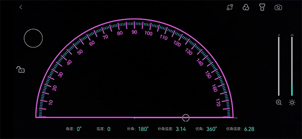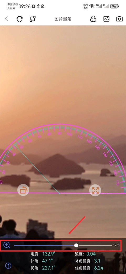 若测量的物体尺寸较小,可借助双指缩放功能放大图片,也能拖动下方的放大条来调整量角器的大小使其放大。