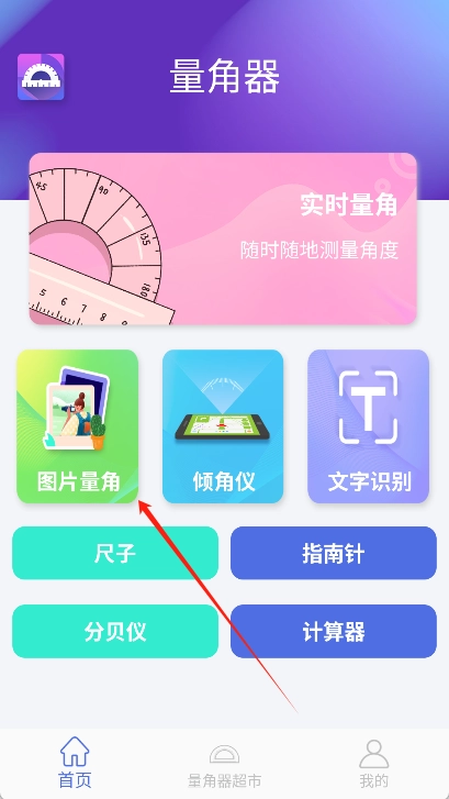 随即打开应用,在首页界面挑选一款测量工具,像图片量角度这样的功能就可以。