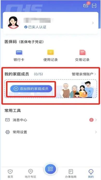 在【我的家庭成员】板块中点击【添加我的家庭成员】选项,然后按照系统给出的操作提示,完成将家人绑定为家庭成员的操作。