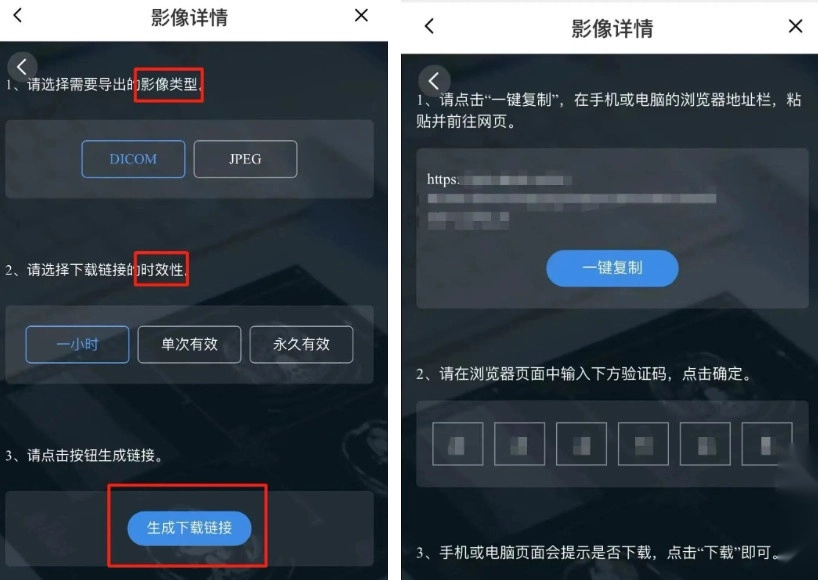 点击影像详情页右下角的对应按钮,即可进入数字影像链接的获取页面。在此页面,您需先选定要导出的影像格式类型以及链接的有效时长,随后点击“生成链接”按钮,就能进入到链接与验证码的获取页面。