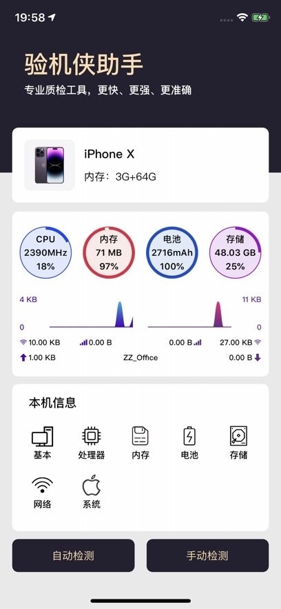 验机侠助手App是一款专业的手机设备检测工具,能够对设备的WiFi、蓝牙、感应器、音频、摄像头、触摸等多种手机功能进行检测。
