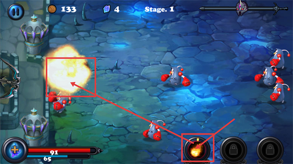 3、战斗过程中要留意技能按钮,释放技能能造成爆炸伤害,在【Stage.1】里可以有效清剿怪物,推动战局进展。