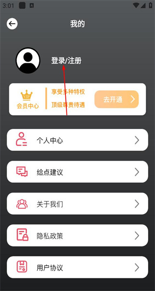 进入我的页面,查看功能选项,点击登录注册区域进入账号操作的选择界面。