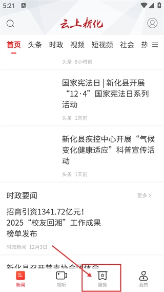 进入【云上新化】的新闻板块,就能浏览各类资讯内容,点击底部导航栏的【服务】选项,即可进入对应的服务功能页面。