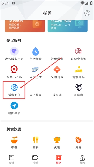 进入【服务】页面后,在【便民服务】板块里找到【话费充值】选项,点击该选项就能进入充值相关的操作界面。