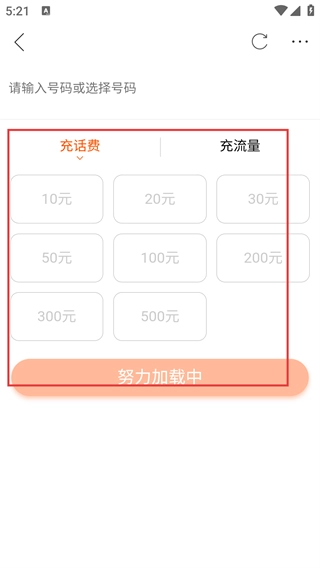 进入话费充值页面后,点击【充话费】板块下的金额选项,待页面加载完毕,就能继续进行话费充值的后续操作。