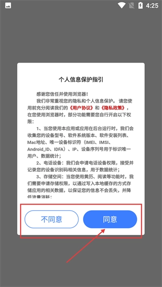 打开轻浏览器后,在弹出的【个人信息保护指引】弹窗里,点击【同意】按钮,确认该协议就能进入浏览器首页了。