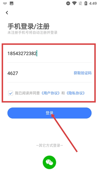 在手机端的登录或注册界面,先填写手机号码,接着获取并输入验证码,勾选相关协议后,点击【登录】按钮即可完成整个操作流程。