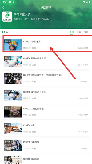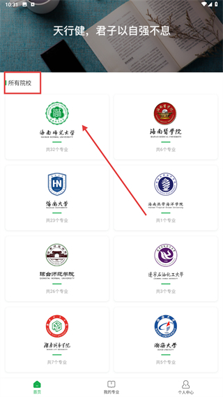 在院校列表页面选择“所有院校”分类,找到并点击“海南师范大学”这一项,进入该校的专业展示页面,即可浏览其设置的各类专业信息。