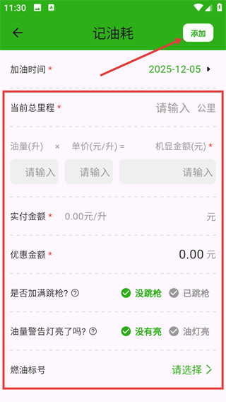 在油耗记录页面填写好相关信息后,点击页面右上角的【添加】按钮,系统会弹出【添加成功】的提示,这样就完成了本次的油耗记录操作。
