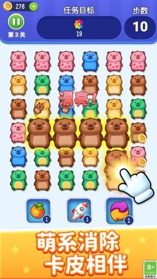 萌萌的卡皮巴拉等小动物形象正等着你来配对消除呢。在关卡里,你可以通过交换元素让同色的连在一起,在规定步数内达成目标,就能开启一场治愈又费脑的消除大冒险啦。