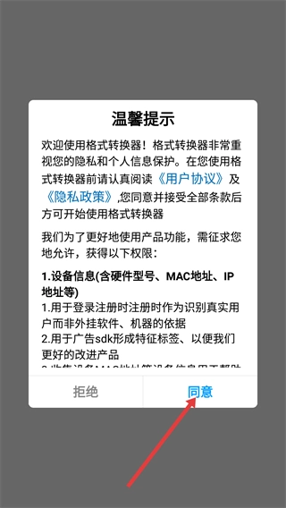 请先仔细阅读【用户协议】与【隐私政策】,在清楚了解所需获取的权限后,点击【同意】按钮,即可使用格式转换器。