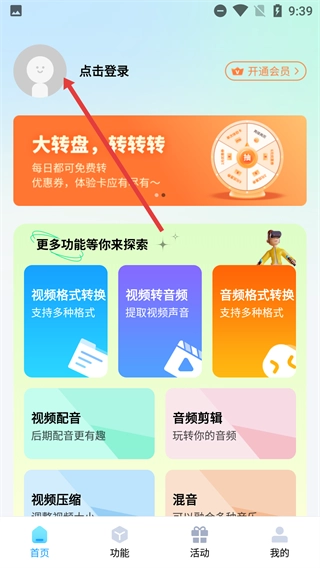 在首页头像区域点击【点击登录】按钮,此页面同时设有【视频格式转换-支持多种格式】等功能选项。