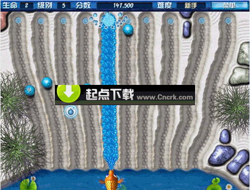 这是一个动作休闲游戏,几个水道并排排列,每条水道都会不失时机地掉落出污染池塘的珠子,不断移动你的鲤鱼,让他喷涌的泉水权力击退那些纷沓而来的珠珠~